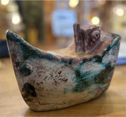The colours of the glaze are creams and terracotta with areas of blue green.