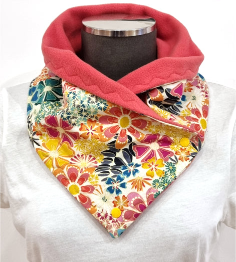 Cozy cotton and fleece neck warmer scarf in bright cheerful floral cotton fabric.